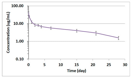 Time-concentration profile of adalimumab in rat plasma from the study subjects receiving 1 mg/kg adalimumab by intravenous administration. The data represent the mean ± standard deviation (SD, n = 4).