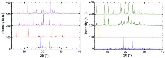 The preparation of the novel salts presented in this study was achieved by an anion exchange reaction between chloride anion and saccharinate or cyclamate anion; therefore, the sodium salts of those sweeteners were chosen. Notably, other co-formers in either salt or acidic form failed to form new solid forms. As illustrated in Figure 1, there was no trace of raw material observed using this method, indicating the formation of new phases. Benexate-saccharinate (BEX–SAC) and benexate-cyclamate (BEX–CYM) were produced with sodium chloride as a byproduct of the anion exchange reaction. However, BEX–SAC and BEX–CYM could be easily separated from sodium chloride by filtration since those salts precipitated first and sodium chloride was retained in solution. This method was effective in producing pure BEX–SAC and BEX–CYM with high yield (>95%). The purities of BEX-SAC and BEX–CYM salts were confirmed by the good agreement between experimental and simulated PXRD patterns and the absence of raw material peaks. The difference in the experimental and simulated PXRD patterns was acceptable due to the preferred orientation effect. The anion exchange reaction also produced pure salts with a high yield of metformin-acesulfame salt [43]. Other attempts using high salt formation screening methods, such as slurry, co-grinding, dry milling using the same salt co-former and solvent system, failed, resulting in sticky amorphous solids.