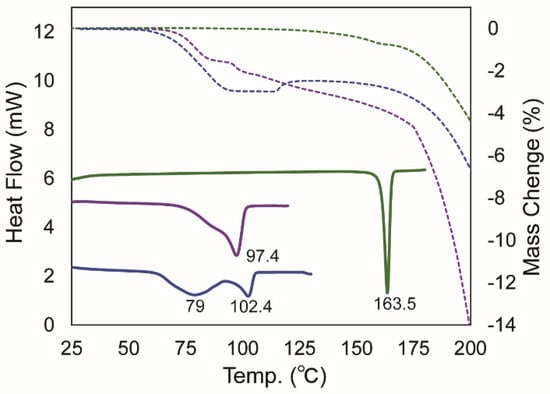 Differential scanning calorimetry (DSC) and thermogravimetry (TG) thermograms of BEX–HCl (blue), BEX–SAC (purple), and BEX–CYM (green). The solid and dashed lines represent DSC and TG thermograms, respectively.