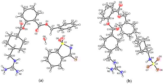 Thermal ellipsoid figures of (a) BEX–SAC and (b) BEX–CYM are drawn at the 50% probability level. The asymmetric unit of BEX–SAC contained a cationic benexate, an anionic saccharinate, and a water molecule. The asymmetric unit of BEX–CYM contained one cationic benexate molecule and one anionic cyclamate molecule.
