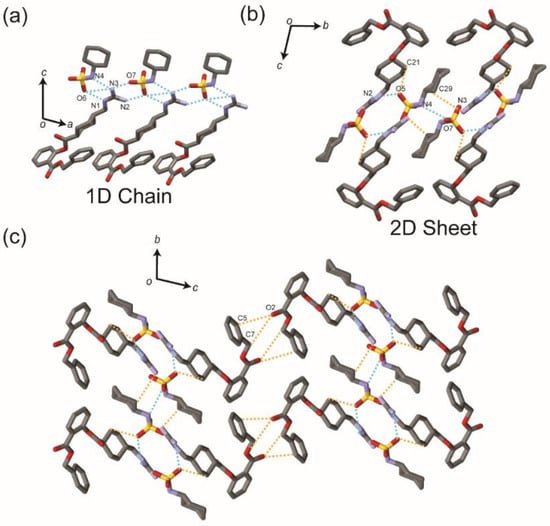 (a) 1D chain and (b) 2D sheet structures in the BEX–CYM crystal. (c) The 2D sheet structure is stacked along the a-axis through C5–H···O2 and C7–H···O2 hydrogen bonds. Conventional and non-conventional hydrogen bonds are drawn by dashed blue and orange lines, respectively. Hydrogen atoms have been omitted for clarity.