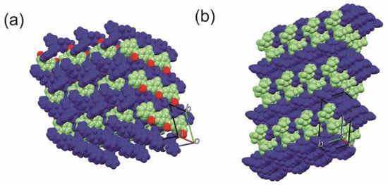 Packing view of (a) BEX–SAC and (b) BEX–CYM. All molecules are drawn in a space-fill setting. Cationic benexate, anionic salt co-former, and water molecules are represented by dark blue, light green, and red molecules, respectively.