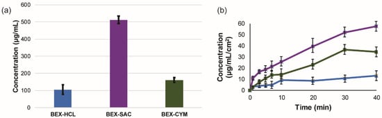 The solubility of BEX–HCL was found to be 104.42 ± 27.60 µg/mL. All new solid forms presented in this study showed improved solubility (Figure 7a). The solubility of BEX-SAC and BEX–CYM was 512.16 ± 22.06 and 160.53 ± 14.52 µg/mL, respectively. This means that the solubility increased 5 and 1.5 times relative to the marketed form of BEX. In agreement with the solubility results, the intrinsic dissolution rate also showed the same trend with BEX–SAC and BEX–CYM showing improved dissolution rates of around 5 and 2 times, respectively (Figure 7b). All solid forms remained the same at the end of the solubility and dissolution rate experiments, as confirmed by PXRD measurements.