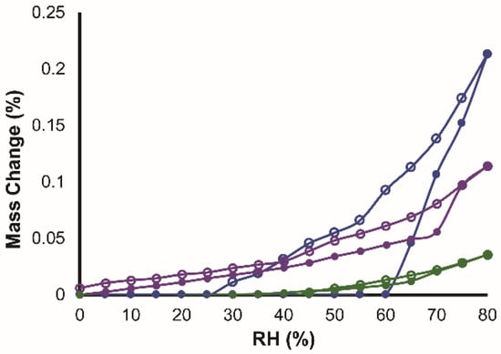 Water sorption–desorption of BEX–HCl (blue), BEX–SAC (purple), and BEX–CYM (green). The closed and open symbols represent sorption and desorption, respectively.