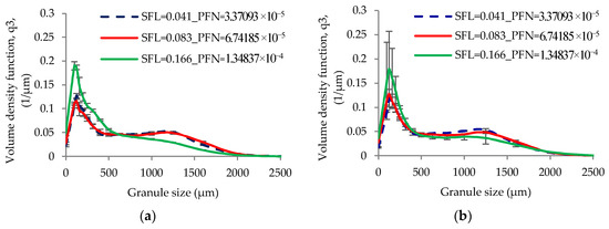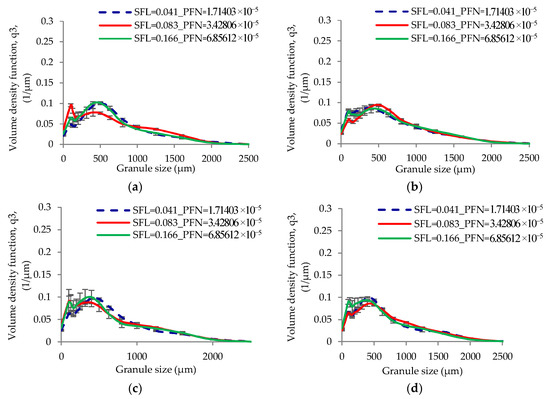 The size distribution results in Figure 17 support the median granule size data obtained at various SFL–PFN. At all three fill levels or SFL–PFN, the granule size distributions were bimodal at all screw speeds. High fill level (SFL—0.166, PFN—1.34837 × 10−4) resulted in more fines or small granules when compared with two other fill levels. As mentioned in case of median granule size, the production of small size granules or fines was potentially a result of reduced powder–liquid interaction because of a shorter residence time or high shearing.