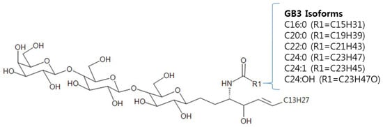 Fabry disease is an X-chromosome-linked inherited lysosomal storage disorder resulting from partial to total deficiency of the lysosomal enzyme α-galactosidase A due to the lack of α-Gal A gene activity [1,2,3]. As a result, glycosphingolipids, mainly Globotriaosylceramide (GB3) accumulates to the tissues primarily in the central nervous system, cardiovascular system, renal system (especially kidney), skin, and muscle [1,2,4,5]. The progression of the disease may affect the normal regulatory function of brain, heart, kidney, and other organs, leading to high morbidity and mortality, low quality of life [6,7]. Several methodologies on the treatment of Fabry disease has been developed including renal transplantation, somatic gene therapy, enzyme replacement using recombinant α-Gal A (e.g., Fabrazyme and Replagal) and the usage of small molecule pharmacological chaperone therapy (e.g., Migalastat HCl) [8,9,10,11,12,13]. With the usage of these treatments, GB3 levels in plasma and tissues dramatically decreases in Fabry patients [4,5,14,15,16]. These results suggest that GB3 can be used as a diagnostic biomarker and may be applied for the screening/monitoring in Fabry patients. However, the complexity of GB3 molecular structure (Figure 1) and a large number of possible GB3 isoforms made the GB3 analysis challenging [17,18].