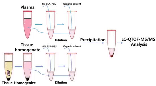 A four-fold volume of 4% BSA-PBS and several zirconia beads (2 mm diameter, Lysing Matrix I®, MP Biomedicals, Solon, OH, USA) was added to blank ICR mouse tissues and the study sample tissues and then homogenized using a FastPrep®-24 tissue homogenizer (MP Biomedicals, Solon, OH, USA) for 3 min to prepare tissue homogenates. Due to the high concentration of the GB3 levels in tissues, all tissue homogenates were re-diluted 200 times (500 times for spleen tissue homogenate) with 4% BSA-PBS. Eleven standard (ten standard for heart) working solutions of GB3 were prepared freshly in duplicate by serially diluting the standard solution at a final concentration of 20, 10, 6.67, 5, 3.33, 2.22, 1.67, 1.11, 0.74, 0.25, and 0.082 μg/mL using DMSO (ten points for heart: 20, 10, 6.67, 5, 3.33, 2.22, 1.67, 0.74, 0.25, and 0.082 μg/mL). A separate weighing of the GB3 reference standard was used to make QCs. Two QC working solutions of GB3 were prepared at a final concentration of 0.8 μg/mL medium QC (MQC) and 4 μg/mL high QC (HQC) using DMSO. Fifty microliter aliquots of each diluted tissue homogenates were added to cluster tubes. The same procedure used for plasma samples was applied for tissue samples and the schematic diagram of the tissue sample preparation procedure is also demonstrated in Figure 2.