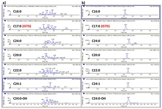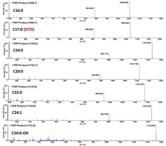 A liquid chromatography–quadrupole time-of-flight mass spectrometric method (LC-QTOF-MS/MS) in the positive ion mode was used to identify GB3 major isoforms. The most abundant ion in the full scan mode was the sodium adduct [M + Na]+ ion for all GB3 isoforms. Due to the heterogeneous fatty acid components of GB3, the most abundant six isoforms were selected for the quantitation: m/z 1046.7 (C16:0), m/z 1102.7 (C20:0), m/z 1130.8 (C22:0), m/z 1156.8 (C24:1), m/z 1158.8 (C24:0), and m/z 1174.8 (C24:0-OH) (Figure 3). Each ion was detected using the single reaction monitoring with the high sensitivity (SRMHS) mode. The product ion showing the most abundant intensity was still the intact parent ion itself when the optimized collision energy was used. Due to the high resolution and accurate mass specificity of the TOF-MS the parent-to-parent ion transition was considered to be applicable [31], and the LC-MS chromatogram also showed good separation (Figure 4). Therefore, this parent-to-parent ion transition approach was used for the analysis of all GB3 isoforms in this study. Although the parent-daughter ion transition by the loss of 162 (except C24:0-OH) was not used for the quantitation of Gb3 isoforms, the unique transitions by the loss of 162 have been monitored as secondary transitions for the confirmation purpose of Gb3 isoforms. The broader peak width of C24:0-OH than those of other GB3 isoforms was likely due to the interaction between the hydroxyl group of C24:0-OH and the column stationary phase.