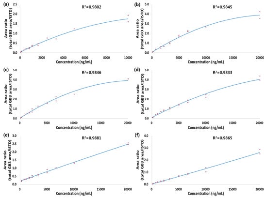 Calibration curve of GB3 in (a) plasma; (b) heart; (c) liver; (d) spleen; (e) kidney; and (f) brain.