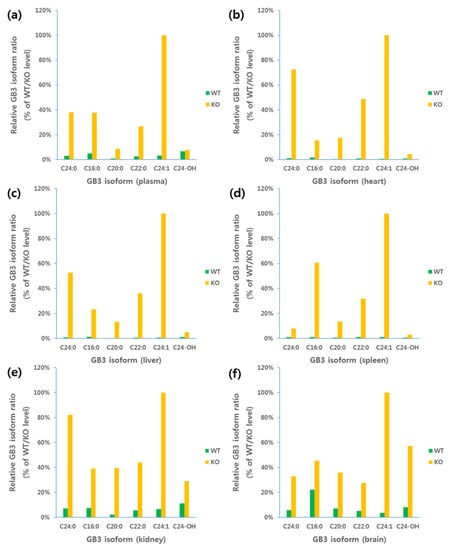 Relative GB3 isoform ratio in plasma and each of the tissues: (a) plasma; (b) heart; (c) liver; (d) spleen; (e) kidney; and (f) brain.