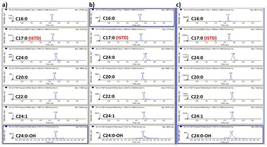 LC-MS chromatograms of GB3 in (a) plasma; (b) heart; and (c) spleen from the Fabry disease model mouse.
