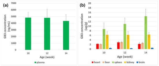 Mice were distributed into three different groups (four mice per group; 10, 12, and 14 weeks of age) to measure the age-related GB3 level changes in KO and WT male mice. All the KO mice were compared to WT mice for the relative GB3 levels in plasma and each of the tissues. At the study completion point, each of the mice was euthanized with CO2. Whole blood was collected in a cluster tube and then centrifuged at 10,000 rpm for 5 min (4 °C). After centrifugation, the supernatant plasma layer was transferred to another cluster tube and stored in a deep freezer at −80 °C until analysis. Tissues (heart, liver, spleen, kidney, brain) were quickly removed, rinsed in cold phosphate-buffered saline (PBS) and stored in the deep freezer at −80 °C until analysis.