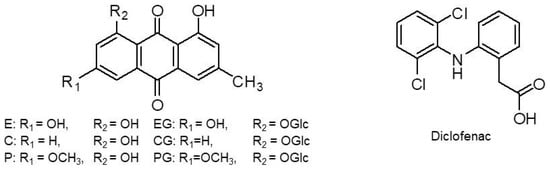 - Moreau, J.P.; Moreau, S.; Skinner, S. Comparative physiological disposition of some anthraquinone glycosides and aglycones. Biopharm. Drug Dispos. 1985, 6, 325–334. [Google Scholar] [CrossRef] [PubMed]