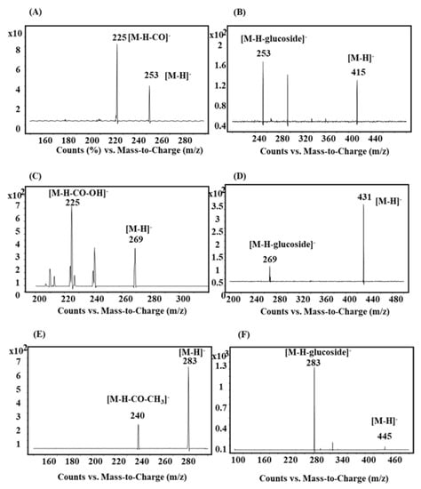 MS/MS scan spectra of six anthraquinones. (A) chrysophanol; (B) chrysophanol-8-O-β-d-glucoside; (C) emodin; (D) emodin-8-O-β-d-glucoside; (E) physcion; (F) physcion-8-O-β-d-glucoside.