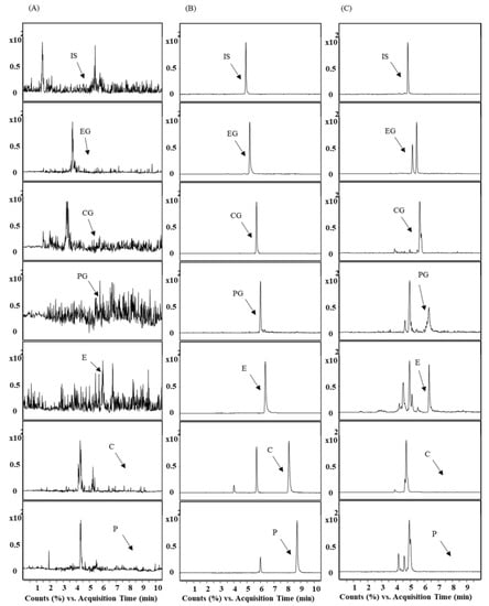 Representative MRM chromatograms of IS, EG, CG, PG, E, C, and P in rat plasma. (A) blank plasma; (B) blank plasma spiked with six anthraquinones (250 ng/mL for aglycones and 125 ng/mL for glycosides) and IS; (C) plasma sample obtained from rats 45 min after oral administration of R. acetosa extract (2 g/kg).