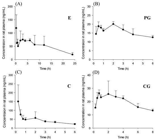 The QC samples were prepared in the same way as the calibration samples for E, EG, C, CG, P, and PG in rat plasma at low, middle, and high concentrations. All the solutions were kept at −80 °C.