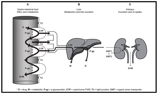 Schematic illustration of the major sites where pharmacokinetic drug interactions can occur after oral administration including the (A) gastro-intestinal tract, (B) liver and (C) kidneys.