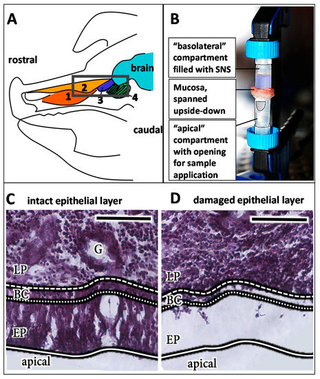 - Glorieux, S.; Van den Broeck, W.; van der Meulen, K.M.; Van Reeth, K.; Favoreel, H.W.; Nauwynck, H.J. In vitro culture of porcine respiratory nasal mucosa explants for studying the interaction of porcine viruses with the respiratory tract. J. Virol. Methods 2007, 142, 105–112. [Google Scholar] [CrossRef] [PubMed]