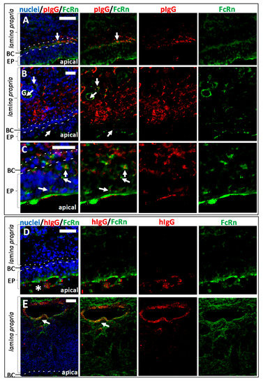 - Dickinson, B.L.; Badizadegan, K.; Wu, Z.; Ahouse, J.C.; Zhu, X.; Simister, N.E.; Blumberg, R.S.; Lencer, W.I. Bidirectional FcRn-dependent IgG transport in a polarized human intestinal epithelial cell line. J. Clin. Investig. 1999, 104, 903–911. [Google Scholar] [CrossRef] [PubMed]