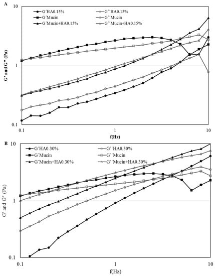 Both Figure 1A,B represent the frequency behavior of the product, HA 0.15 % and HA 0.30% respectively, compared to system obtained with mucin. It is evident that with the mucin the elastic modulus G′ and the viscoelastic modulus G″ increased in both products. At lower frequencies both products exhibited fluid-like mechanism spectra with G″ modulus greater than G′, being both frequency dependent. As the frequency increases occurs a crossover at approximately 2–5 Hz, turning the G′ modules greater than the G″, indicating both products started to have a more elastic behavior.