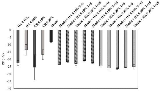 ZP is related to the measurement of the surface charge that a specific material possesses or acquires when suspended in a fluid. This study demonstrated that the ZP values of HA 0.15% and HA 0.30% are similar to their market equivalent formulation, CR 0.15% and CR 0.30%, respectively. However, comparing the values of the two products their values are quite different being HA 0.15% ZP values much more negative that HA 0.30% values, which in absolute is higher (Figure 2). These negative values are in accordance with the anionic nature of the HA due to the presence of carboxylic groups. The mucin also presents negative charge due to the oligosaccharide chains which confer negative charge through carboxyl and sulphate groups. The obtained value is similar with the existing literature, which is approximately −10 mV [29,30]. When the mucin is added to both products an increase of the negative charge is observed, being the ZP value more negative in mucin 5% + HA 0.30% than with mucin 5% + HA 0.15%.