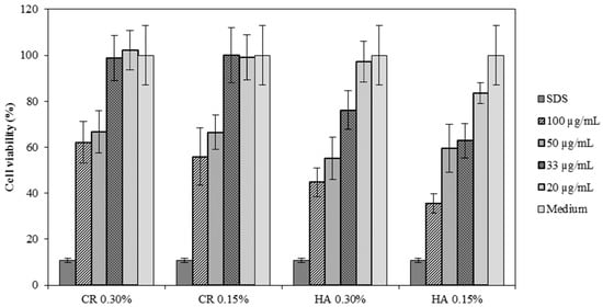 An initial test to evaluate the potential irritant of the HA formulations was performed to choose the most suitable dilution to be used on the next assays. Four dilutions were prepared 100 µg/mL (1:1), 50 µg/mL (1:2), 33 µg/mL (1:3) and 20 µg/mL (1:5). In Figure 3 it is evident that the 1:5 dilution presents a high rate of survival in all samples with cell viability above 80%. The 1:3 dilution although the CR samples demonstrated high survival rate (approximately 100%), the HA samples did not show the same results. For that reason, it was decided to use the 1:5 dilution on the next assays.