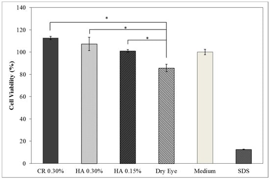 Cell viability of ARPE-19 cell lines exposed for 24 h to HA 0.15% and HA 0.30% formulations and commercial formulation (CR) containing 0.30% of hyaluronic acid (mean ± SD, n = 9). (* Significant statistical differences between both formulations p < 0.05).