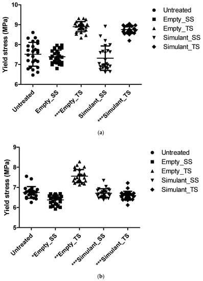 Trend of yield stress values for containers filled with simulant after simulated solar irradiation (SS) or thermal shock (TS): (a) Linear low-density polyethylene (LLDPE) packaging (statistical significance: *** p < 0.0001 compared to Untreated); (b) Low-density polyethylene (LDPE) packaging (statistical significance: * p = 0.2 compared to Untreated; ** p = 0.025 compared to Untreated; *** p < 0.0001 compared to Untreated).