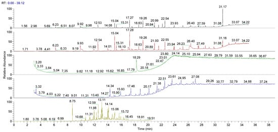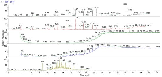A preliminary study was performed on the untreated LLDPE and LDPE. Multiple extraction processes were evaluated in relation to the plastic materials investigated and according the literature [27]: Sonication, Sealed Vessel, Soxhlet, and HS-SPME. Figure 3 and Figure 4 show the GC/MS chromatograms of all the extraction methods of untreated LLDPE and LDPE single dose containers. Chromatographic analyses showed that HS-SPME and Soxhlet extractions provide complete insight into all the major organic extracts for the analyzed materials. The HS-SPME extraction contained the same extracts as n the Soxhlet extraction, but with higher concentrations, so the methods were optimized. HS-SPME extraction was defined as the best method for performing the controlled extraction of volatile organic extracts in plastic material obtained from the final packaging.