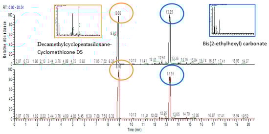 After simulated solar irradiation or thermal shock of the filled samples, substances closely related to the simulant were detected in the extractable profile of the plastic material. These substances were identified as Decamethylcyclopentasiloxane-Cyclomethicone D5 and Bis(2-ethylhexyl) carbonate, and they represented nearly 95–96% of the total extracted compounds. Figure 4 shows chromatograms of the LLDPE and LDPE single dose containers filled with simulant after simulated solar radiation.
