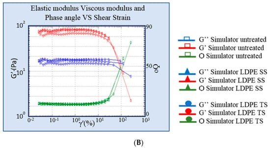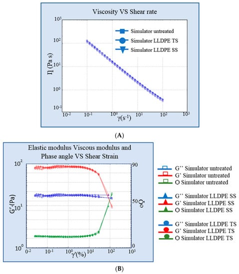 (A) Viscosity curve of simulant in linear low-density polyethylene (LLDPE) vs. untreated simulant. (B) Elastic and viscous modulus curves of formulation in LLDPE vs. untreated simulant. SS: simulated solar irradiation, TS: thermal shock.