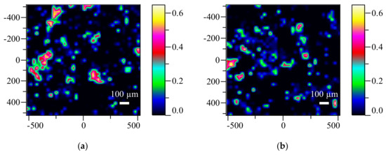 Since directly searching for the API at such a low-dose (50 µg) with Raman spectrometry is a very challenging task, an indirect method was applied. Given the fact, that the API is molecularly dispersed in the PVPVA64 polymer matrix [54], we can assume that the homogeneity of the API is related to the homogeneity of the polymer. Consequently, the maps were taken accordingly. These results are shown in Figure 4.