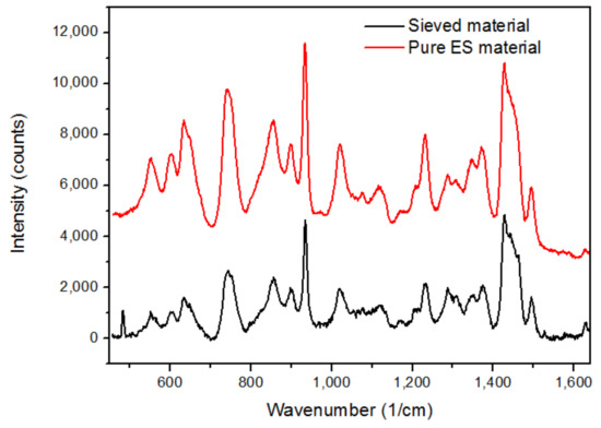 According to the weighed sieve fractions, HSM homogenization was able to decrease the 355 µm portion by more than ten times compared to LSM mixing. This is crucial since the bulk of the pure electrospun materials was recovered on this sieve and, more importantly for complete homogenization, particle sizes should be as close to each other as possible to avoid segregation [55]. Based on these results, the high-performance impeller and chopper blades present in the HSM can further reduce the average particle sizes (due to high shear forces) of the fibrous materials, thus superior mixing of materials can be realized. These aforementioned fractions were also evaluated by Raman spectroscopy to look for traces of electrospun material. The spectra are shown in Figure 5.