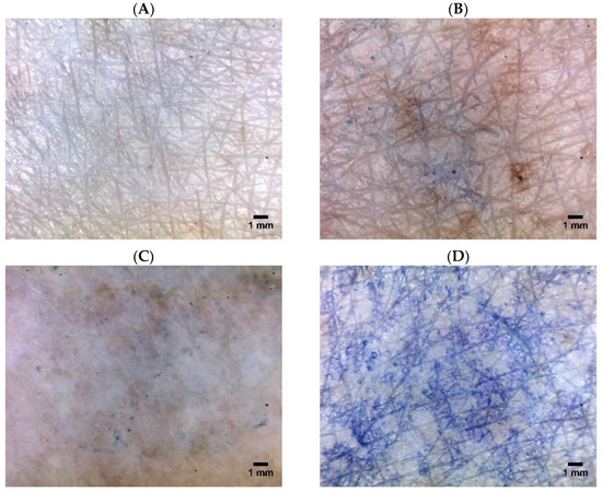 After the physical treatments (Table 1), we applied the dye solution on the treated site of human cadaver skin. No absorption of methylene blue occurred on the untreated or intact skin (Figure 2A). This observation could be explained by the hydrophilicity of methylene blue that blocked its penetration across the stratum corneum layer of skin. At 1 h post-treatment by either anodal or cathodal ITP, the skin tissue became more accessible to the dye (Figure 2B,C). This result might be attributed to the drug transport through the skin layer during the ITP application, creating some penetration pathways, which appeared visible on the microscopic images. Furthermore, the skin gradually hydrated in contact with the donor and receptor fluids, thus increasing the permeability to the dye. The effect of ITP on the skin barrier was previously investigated using a freeze-fracture electron microscopy, light microscopy, and Fourier-transform infrared spectroscopy. The authors suggested that, at low-current densities, ITP disorganized the stratum corneum locally, whereas ITP at higher-current densities resulted in a general disruption of the stratum corneum lipid [37,38]. Furthermore, ITP was found to increase the dimensions of the hair follicles to facilitate drug penetration. Fast recovery of the skin integrity in vivo and relatively low possibility of skin irritation were expected when the current was discontinued [24].