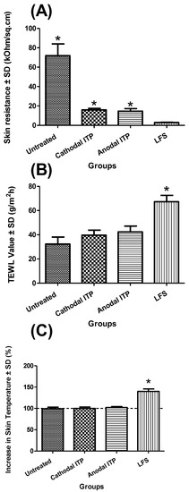Changes in TEWL values could indicate possible modification of the skin integrity. A disruption of the skin barrier function would result in an enhancement of water loss through the skin tissue, thus elevating the TEWL values [46,47]. Thus, TEWL could be employed to evaluate the extent of skin barrier disruption. No marked difference was observed in TEWL values between passive and ITP groups (p = 0.05). LFS (67.25 ± 5.23 g/m2 h), resulting in a significantly higher TEWL value of cadaver human skin as compared to passive (32.30 ± 5.79 g/m2 h), anodal ITP (42.30 ± 4.88 g/m2 h), and cathodal ITP (39.63 ± 1.35 g/m2 h) (p < 0.05) (Figure 3). This observation indicated that ultrasound treatment considerably disturbed the skin structure. Further, we disclosed a negative correlation between the skin electrical resistance and TEWL values. Herwadkar et al. found that TEWL value of excised hairless rat skin increased notably from 31.6 ± 0.12 g/m2 h to 69.5 ± 12.6 g/m2 h due to the 2-mjn application of low-frequency ultrasound. However, this notable increase was absent when the ultrasound energy was applied for a shorter period (1 min) [9].