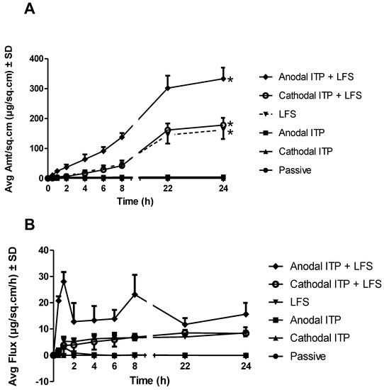 Interestingly, the combination of anodal ITP and sonophoresis (anodal ITP + LFS, 333.10 ± 37.01 µg/sq·cm) delivered a markedly higher drug amount into the receptor fluid than the use of sonophoresis alone (n = 4, p < 0.05), while the combination of cathodal ITP and sonophoresis (cathodal ITP + LFS, 178.30 ± 23.79 µg/sq·cm) resulted in a comparable drug delivery as sonophoresis alone (p = 0.43). These comparisons appeared consistently in flux and permeability coefficient (Figure 4). Physical treatments led to a notable enhancement of both permeability coefficient and flux than passive permeation (p < 0.05) (Table 2). Being employed either alone or in combination with sonophoresis, anodal ITP was always superior to cathodal ITP (p < 0.05). The addition of sonophoresis to ITP led to a higher delivery effectiveness than the use of ITP alone.