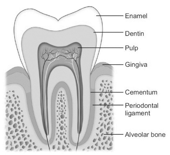 Teeth are composed of dental tissues that can be divided into two main groups: mineralized hard and non-mineralized soft tissues. The mineralized hard tissues are enamel, dentin, and cementum. The non-mineralized soft tissue is the pulp. Figure 1 shows the structure of a tooth and its periodontium. Enamel is the most mineralized substance in the human body and covers the outer aspect of the crown of a tooth. Enamel is composed mainly of hydroxyapatite, a crystalline calcium phosphate with a low solubility product constant [2]. Dentin is the layer underneath the enamel. It is less calcified than the enamel and makes up the bulk of the crown and roots. It also surrounds the pulpal tissues within the tooth. When the dentin is exposed, the dentinal fluid flows outward through dentinal tubules from the pulp [3]. Cementum is the tissue layer that covers the roots of a tooth and surrounds the underlying dentin. The cementoenamel junction is where the enamel and cementum meet. It marks the boundary between the crown and the roots of the tooth. The pulp is a soft tissue composed of nerves and vessels and fills the internal cavity of a tooth. It delivers the nutrition, provides sensory function, and controls the blood flow [4]. The supporting structure of the teeth is called periodontium. The periodontium includes the periodontal ligament, gingival tissue, bone, blood, and nerves around the teeth. The periodontal ligaments are groups of fibers that act as a shock-absorber for the teeth and hold the cementum to the bone [5]. The thickness of each part of the tooth differs from species to species and from person to person. Human premolars have average enamel thickness of 1.39 mm and dentin thickness of 1.79 mm [6].