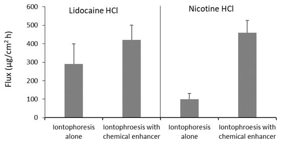 Lidocaine and nicotine fluxes of porcine buccal iontophoresis at 0.3 mA alone and with 5% dodecyl-2-(N,N-dimethylamino) propionate (DDAIP) as chemical enhancer. The combination of iontophoresis and chemical enhancer increases the fluxes of both drugs. Data from reference [73].