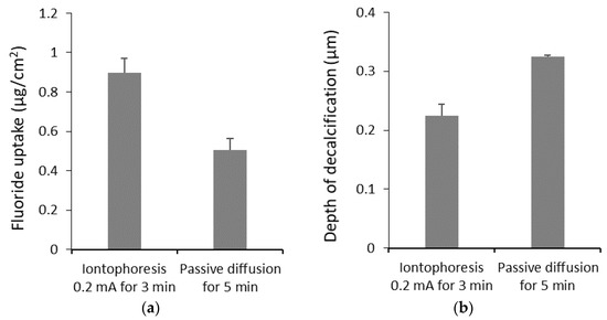 Previous studies have suggested that iontophoresis can enhance the delivery of fluoride into enamel (Table 1). For example, in Figure 5, Tanaka et al. showed that iontophoresis could increase the uptake of fluoride and decrease decalcification by acid compared to those in the absence of iontophoresis [82]. However, Kim et al. found no significant difference in the reduction of lesion depth between iontophoresis-treated bovine incisors vs. conventionally applied fluoride, despite that iontophoresis increased the concentration of fluoride in the specimens [80]. Other studies have also suggested that the effect of fluoride iontophoresis on tooth remineralization was not superior to other fluoride application methods such as acidulated phosphate fluoride gel and sodium fluoride varnish [79,81]. Particularly, iontophoresis did not show any significant effects on the remineralization on initial carious lesions between treatment regimens compared to the other fluoride treatments, suggesting that remineralization likely occurred irrespective of the treatments despite that a higher amount of fluoride could be delivered into the enamel with iontophoresis. In addition to fluoride, iontophoresis was shown to enhance the penetration of iodide into enamel [87]. Ikeda et al. investigated the transport of lidocaine across human enamel with alternating current (AC) iontophoresis [72]. Chinnapareddy evaluated the relationship between the voltage and electric current for iontophoresis on enamel in humans in vivo [71]. To study the mechanisms of iontophoretic transport across enamel, Ren et al. examined the barrier and electrical properties of enamel [83]. It was shown that enamel is a resistive barrier for ions with permeability coefficients of ~10−7 cm/s (at thickness of ~0.5 mm) and transport pathways of neutral or low pore charge density and effective pore radii of approximately 0.7–0.9 nm. In the same study, iontophoresis of enamel for sodium fluoride, MFP, and SnF2, active ingredients in common dentifrice, was compared.