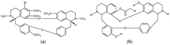 Structures of 5-bromotetrandrine and W6. (a) Bromotetrandrine (11S,31S)-35-bromo-16,36,37,54-tetramethoxy-12,32-dimethyl-11,12,13,14,31,32,33,34-octahydro-2,6-dioxa-1(7,1),3(8,1)-diisoquinolina-5(1,3),7(1,4)-dibenzenacyclooctaphane []; (b) W6 [].