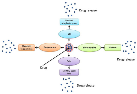 Advancements in polymer chemistry have led to the fabrication of smart polymer systems. These systems enable further control over the physicochemical behaviour of the polymers which is highly desirable in the targeted delivery of chemotherapies. Smart polymeric materials or environmentally-responsive polymers, are polymers that respond to different stimuli or changes in the environment, for example temperature, pH, electric and magnetic fields, light intensity, biological molecules, etc. [32,33] (Figure 1). These stimuli can result in many responses such as a change in colour or transparency, becoming conductive, increased permeability to water or changing shape [34,35]. In all instances, these systems may be formed by, either drug encapsulation via hydrophobic–hydrophobic interaction, physical conjugation onto the polymer backbone creating an amphiphile or, indeed, surface functionalisation of a preformed nanoparticle.