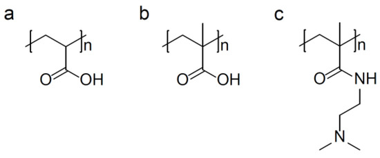 Chemical structures of common pH responsive polymers: (a) poly(acrylic acid); (b) poly(methyacrylic acid); and (c) poly(N,N-dimethyl aminoethyl methacrylamide).
