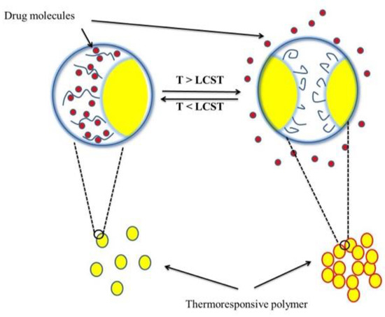Generally, the solubility of most substances will increase with increased temperature. Smart polymers have been developed which exhibit either an increase or a decrease in solubility in response to a change in temperature. This unique property has resulted in a great focus on thermo-responsive polymers as modern, highly controllable drug delivery systems. Temperature responsive polymers display a fine hydrophobic–hydrophilic balance in their structure which is switchable over small temperature ranges. These adjustments result in bond contraction or stretching, forming new conformations around the hydrophobic moiety and the hydrophilic polymeric chains within the fluid media. The conformational change of the polymer is dependent upon the physical condition of the chains. In the event that the macromolecular chains are straight and solubilised, the arrangement will change from mono-phasic to bi-phasic due to the polymer precipitation upon initiation [70]. This change in polymer structure can be exploited for triggered drug release.
