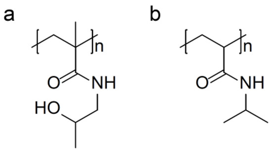Chemical structure of commonly used thermos-responsive polymers: (a) poly(hydroxypropylmethacrylamide); and (b) poly(N-isopropylacrylaminde).
