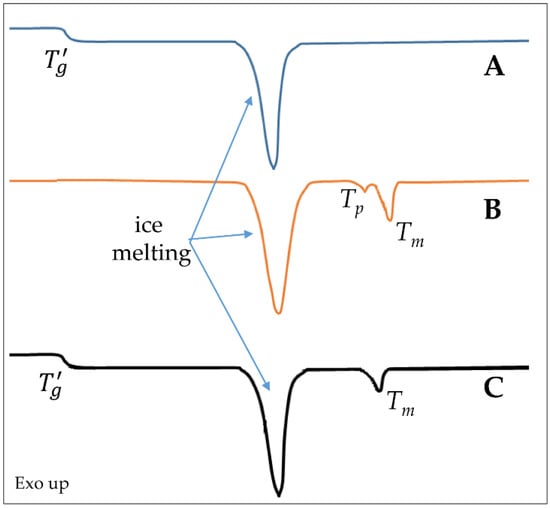Schematic representation of thermal events detectable by differential scanning calorimetry (DSC) in a simplified system: (A) typical trace of an amorphous protectant; (B) typical pattern of liposomes made of a phospholipid with a Tm significantly higher than melting ice temperature; (C) representation of an ideal thermogram registered on a liposome dispersion containing the protectant. Tg’: glass transition temperature of maximum freeze concentrate; Tp: pre-transition temperature of fully hydrated phospholipids; Tm: phase transition temperature of fully hydrated phospholipids.