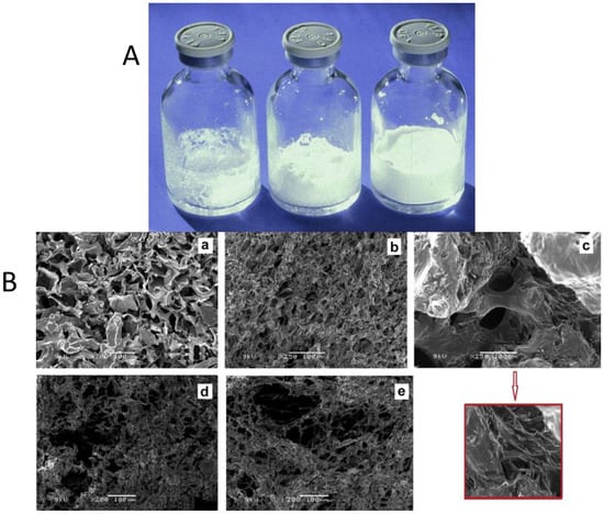 Possible macro and micro appearance of cakes obtained by freeze drying. (A) Collapsed cake: total collapse (left) and partial collapse (center). The vial on the right shows no evidence of collapse; (B) SEM images of freeze-dried liposomes in presence of trehalose (S:L = 5:1) with a 200 times magnification (a); in presence of sucrose (S:L = 5:1) with a 250 times magnification (b); in presence of sucrose and mannitol (S:L = 5:1) with a 250 times magnification; no lyoprotectant (control) with a 200 times magnification (d); in presence of trehalose (S:L = 3:1) with a 200 times magnification, (e) respectively. S:L represents the carbohydrate to lipid molar ratio. The insert in red highlights the crystallized mannitol in sample (c). Reproduced with permission from [50,51], Elsevier Inc., 2018.