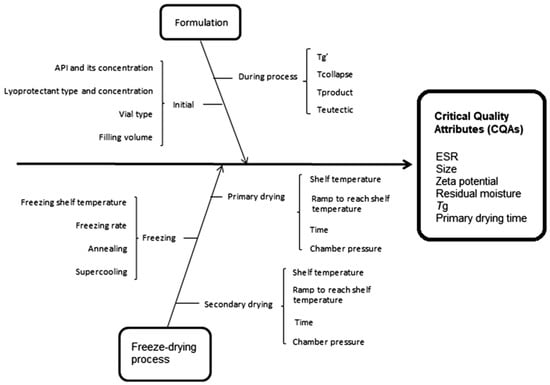 As an example, Sylvester et al. applied the QbD approach to improve the final product quality of liposomes loaded by pravastatin in terms of drug leakage, size, ζ-potential, residual moisture contents, Tg and cake appearance, and to shorten the freeze-drying process as much as possible [89]. Among the CPPs influencing the CQAs (Figure 6), the impact of freezing rate, inclusion of an annealing step and primary drying at temperatures below and above Tg’ or slightly higher Tc were investigated.
