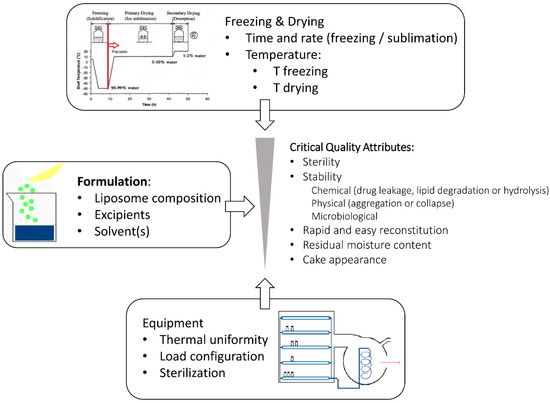 Schematic representation of the factors influencing the critical quality attributes of freeze-dried liposomes.