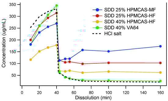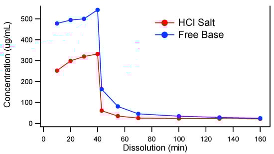 Because the model compound, MK-A, is a weak base, it is important to understand the precipitation tendency of MK-A upon pH increase. Two-stage dissolution testing (mimicking gastric conditions for 30 to 45 min followed by a change in pH to mimic the small intestine environment for at least 2 h) can be used as a tool to project the potential in vivo performance of oral solid dosage forms []. The two-stage dissolution profiles of MK-A free base and its HCl salt are displayed in Figure 1. As can be seen from the figure, under the acidic condition (0–40 min), the free base and HCl salt of MK-A have a higher concentration of 543 and 333 µg/mL, respectively. Upon the pH change at 40 min, the drug precipitates and the concentrations of both forms of API are reduced to 24 µg/mL. These results suggest that MK-A has a strong precipitation tendency upon pH increase, and the initial dissolution (drug dissolved) achieved in gastric fluid may not strongly enhance the bioperformance. It should also be noted that the lower drug concentration of the HCl salt in the stomach pH could be due to the common ion effect.
