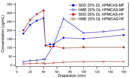 Two-Stage dissolution of MK-A solid dispersions prepared by spray drying or hot melt extrusion (Powders of the solid dispersions were used for the dissolution. For HME dispersions, the original HME extrudates were milled to a particle size of 213 μm). DL, drug load.